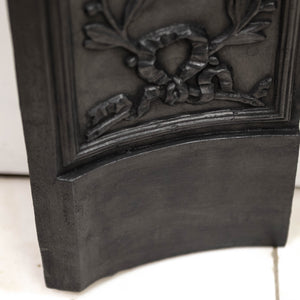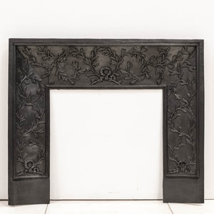This insert features beautifully cast laurel wreath and ribbon decoration, a classical motif associated with late Georgian and early Victorian interiors. The design runs continuously across the header and down the legs, with additional ribbon cartouches to the lower panels.