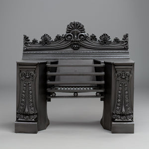 A finely cast Georgian hob grate with ornate neoclassical detailing, including scrollwork, foliate panels, and a prominent cresting. A very handsome and impressive piece.