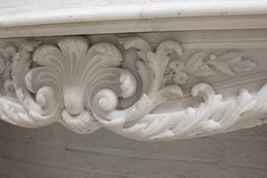 The soft, creamy white tone of the marble provides a neutral backdrop for the intricate carvings and ornate details that adorn its surface, adding a touch of luxury to any room in which it is placed.
