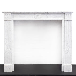 A reclaimed French-style Louis XVI fireplace surround crafted from Carrara marble.