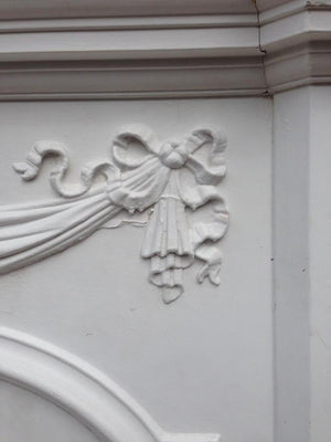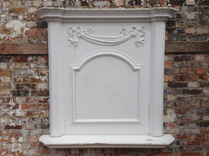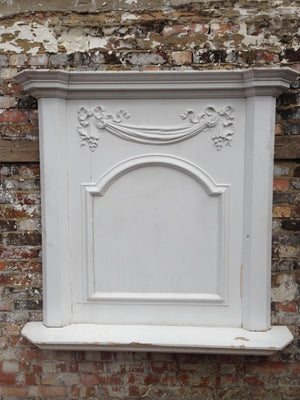 An antique Regency fireplace overmantel in painted pine. This elegant fireplace overmantel features a pair of bow and swag motifs, as well as a curved reeded panel.