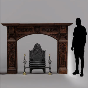 An impressive example of late 19th century craftsmanship, this the Arts and Crafts chimneypiece is hand-carved from richly toned oak, it features deep-profile ornamentation throughout, including scrolling foliage, classical motifs, and intricate monograms at the centre and end.