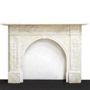 A substantial and striking antique fireplace surround with ornate carvings and crafted from statuary marble.