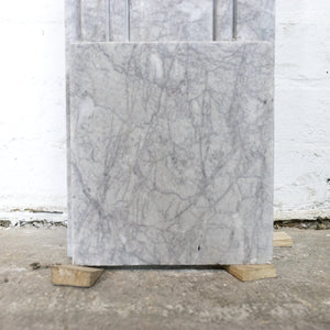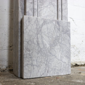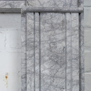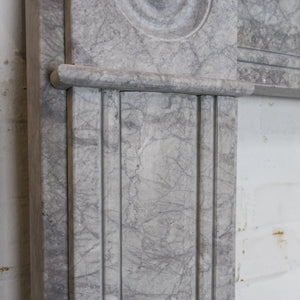 This fire surround features a typical Georgian roundel design to the top of each, with roundels on each end block as well as reeded jambs and lintel. The surround has been made up from marble that was reclaimed from the London School of Economics, in Central London. The marble has a soft grey tone with contrasting veining.