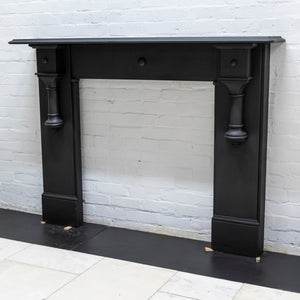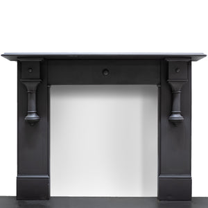 An original Victorian fireplace surround crafted from slate with carved corbels and columns.