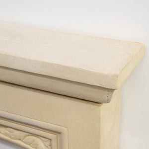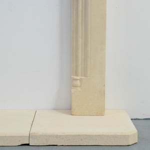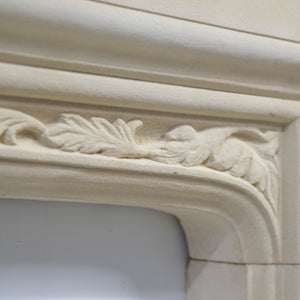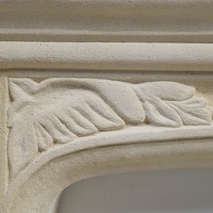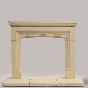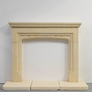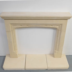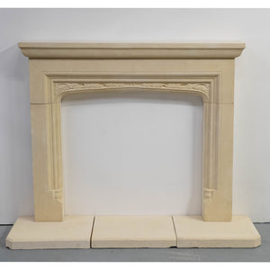 Reclaimed stone fireplace surround with matching hearth sections. The surround is made from a pale buff stone with a moulded shelf and a shallow arched opening. The frieze is decorated with a carved leaf motif running across the arch. The jambs are plain with stepped mouldings and small decorative blocks near the base.