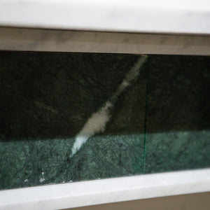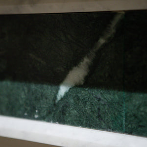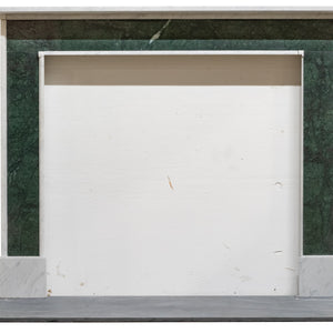 The richly coloured Verde inlaid to the jambs and frieze provides an interesting contrast to the simplicity of the Carrara marble and simple form. The surround stands proud on simple block ends.