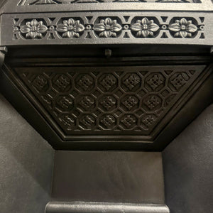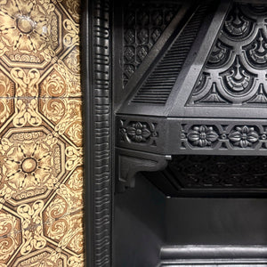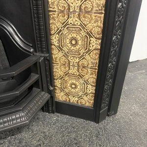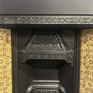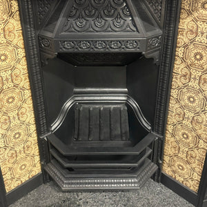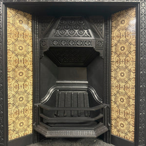 This pretty Victorian piece features two panels of original tiles either side of the basket, with a delicate motif border that surrounds the opening. The hood is adorned with intricate details of florals which marry the design of the tiles.