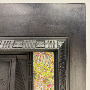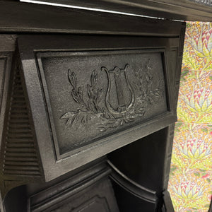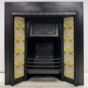 A original Victorian tiled insert, beautifully restored to showcase the craftsmanship and decorative flair of the 19th century. The cast iron insert features an ornate lyre motif to the centre panel, framed by a bold geometric border - both elegant and timeless in design.