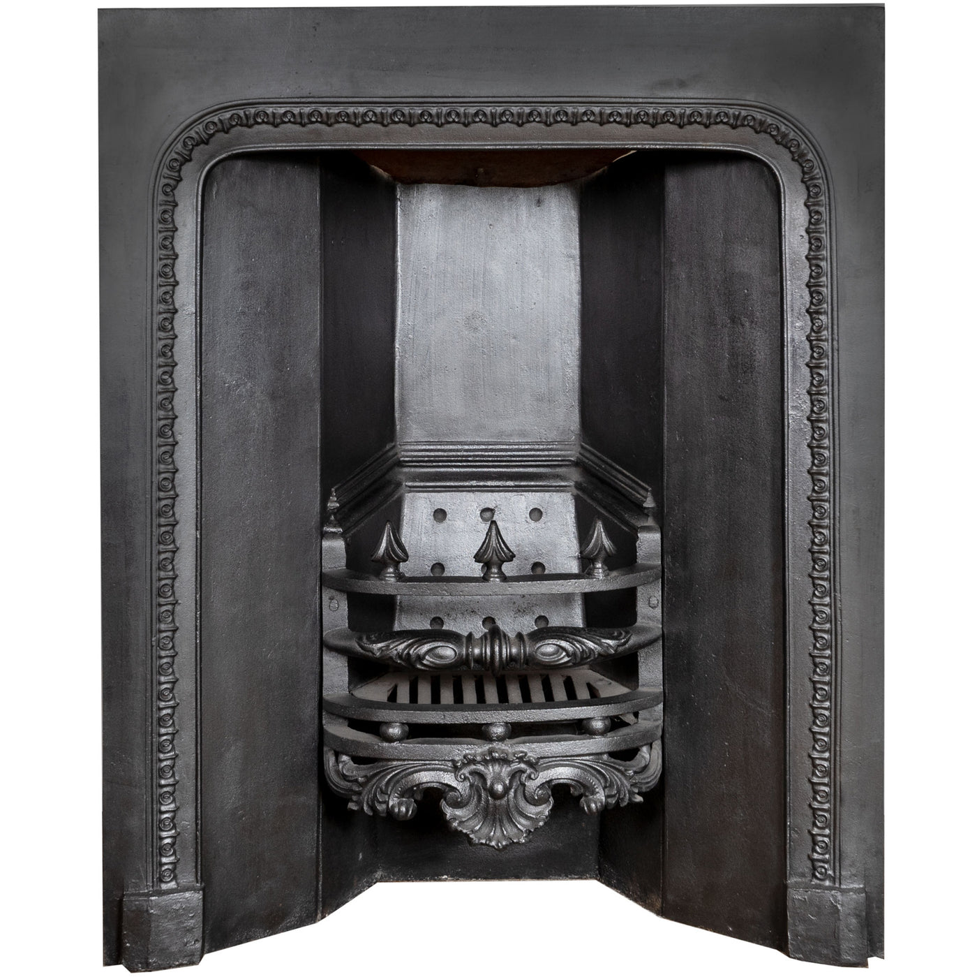 Then comes the choice of what to put inside the surround; a fire basket, a swan’s nest with fire dogs, a hob grate, or an insert. If your house is early Georgian or Regency, you may want to look at having a hob grate within the surround, whereas later Georgian or Victorian styles generally had register grates or inserts. Full inserts are more efficient as less heat escapes and is instead radiated into the room by the cast iron surrounding the basket.