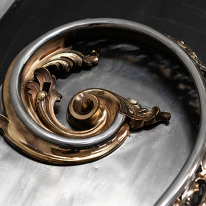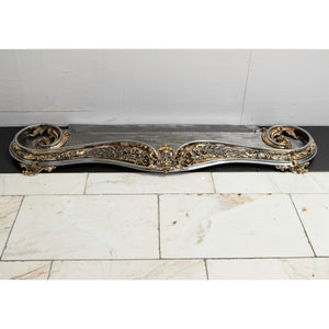 Highly ornate, this antique brass fireplace fender is in the Louis XV style with elaborate decorative features including florals, foliate scrolls and mermaids. The polished steel is complimented by abundant brass detailing.