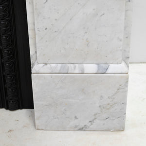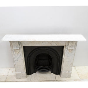 The bevelled shelf is substantial with good projection, supported by deeply cut solid marble corbels. The frieze and jambs are simple with no panelling.