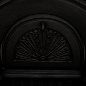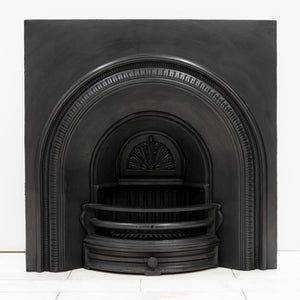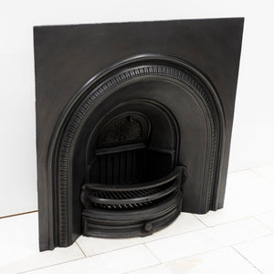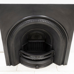 Antique Cast Iron Arched Fireplace Insert with an arched opening and ornate border.