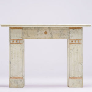 The surround is architecturally composed with thumbnail detailed jambs with a trio of warm Siena buttons and a well-proportioned frieze centred with a circular rouge marble dome. The restrained palette and delicate ornament reflect the Edwardian preference for classical clarity with subtle decorative contrast.