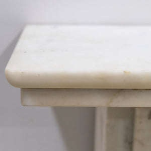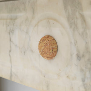 A refined Edwardian marble fireplace surround, dating to the early 20th century, carved from fine Carrara marble and enriched with Giallo odi Siena marble.