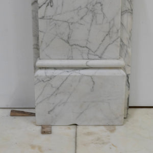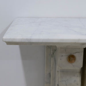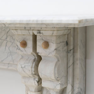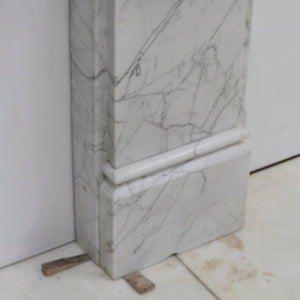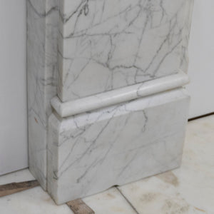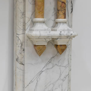 This is a finely crafted antique fireplace surround, executed in high-quality Italian Carrara marble with a classic white and grey veining pattern. The design reflects late 19th-century Neoclassical influence, distinguished by its symmetrical form, linear proportions, and restrained ornamentation featuring striking Sienna marble.
