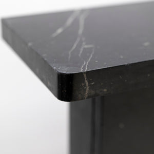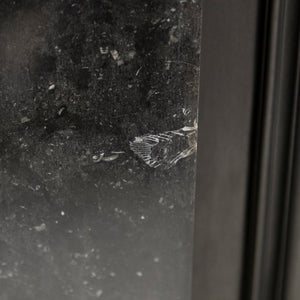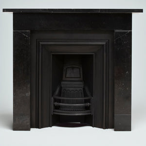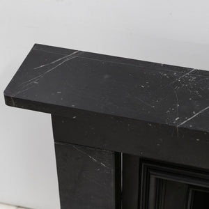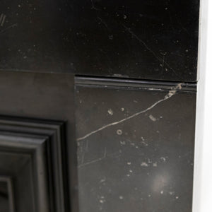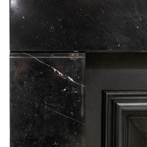 The surround is beautifully proportioned, with a broad, understated mantel shelf above cleanly defined jambs, all cut from dense Belgian Black marble richly figured with natural and fossil inclusions.