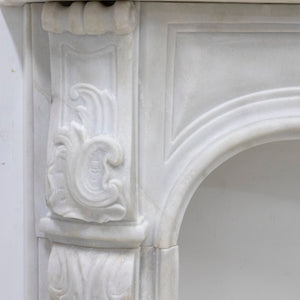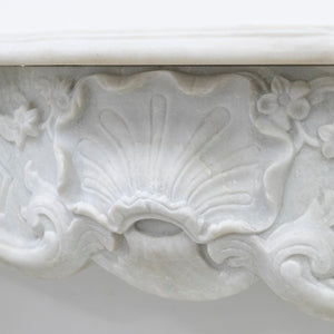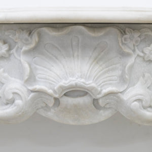 A beautifully carved Louis XV style fireplace crafted from Statuary marble. The antique chimneypiece has a flowing frieze with a carved shell cartouche.