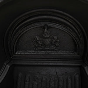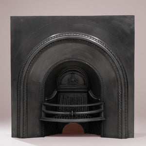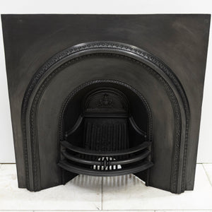 Antique Cast Iron Arched Fireplace Insert with an arched opening and elegant ornate border.