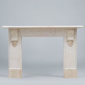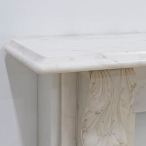 This refined early Victorian chimneypiece, crafted from fine Italian Carrara marble, showcases intricately carved corbels with foliage motifs, a large bevelled shelf rests atop.