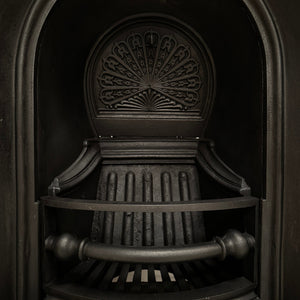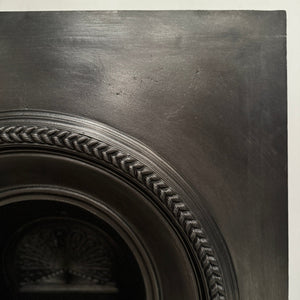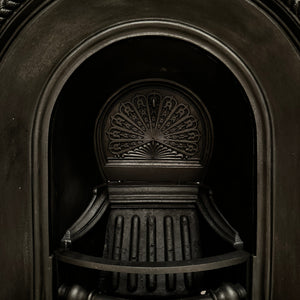 This wonderful antique fireplace insert features an elegant arched design, characteristic of the Victorian period. The insert is framed by a bold rope-twist border that adds texture and depth to the overall form. Inside, the focal point is a beautifully detailed fan motif set into the backplate, radiating a sense of refinement and classical influence.