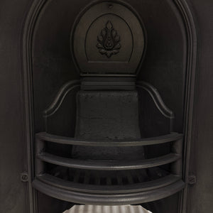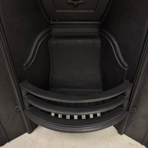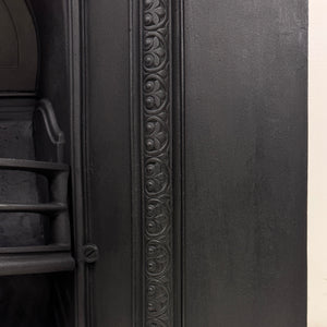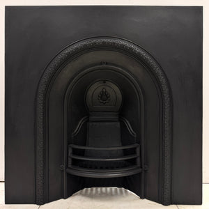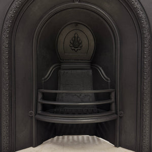 This antique cast iron fireplace insert features a beautifully arched design with intricate detailing along the inner and outer edges. At its centre, a delicately cast fan-shaped motif crowns the back plate, adding elegance and charm.