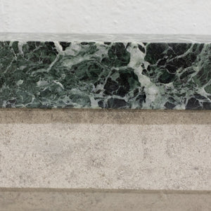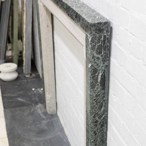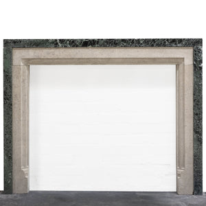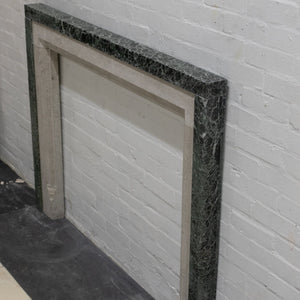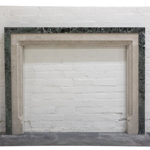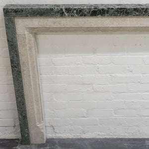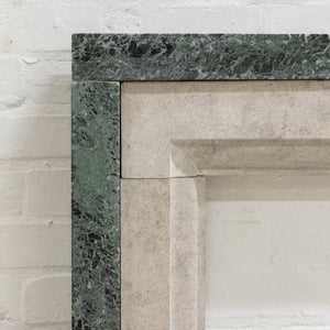 A rare find, this striking chimneypiece has been carved and crafted from fine Portland stone and enigmatic green Verdi Marble