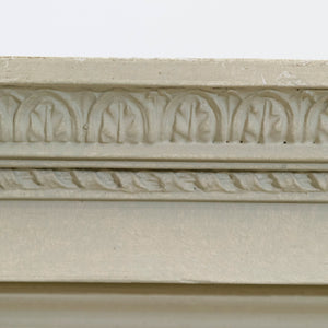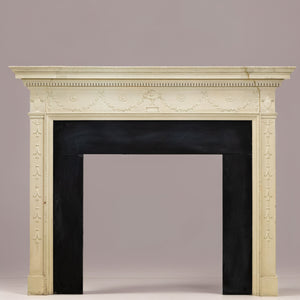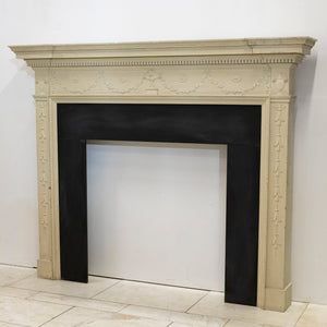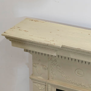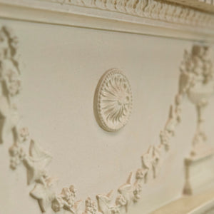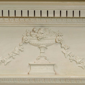 The frieze is finely detailed with classical garlands, paterae and urns, framed by crisply moulded bands and dentil work, all surmounted by a deep projecting shelf. The jambs are adorned with elegant vertical reliefs. The scale of the piece makes it particularly well suited to grand reception rooms, drawing rooms or formal interiors.
